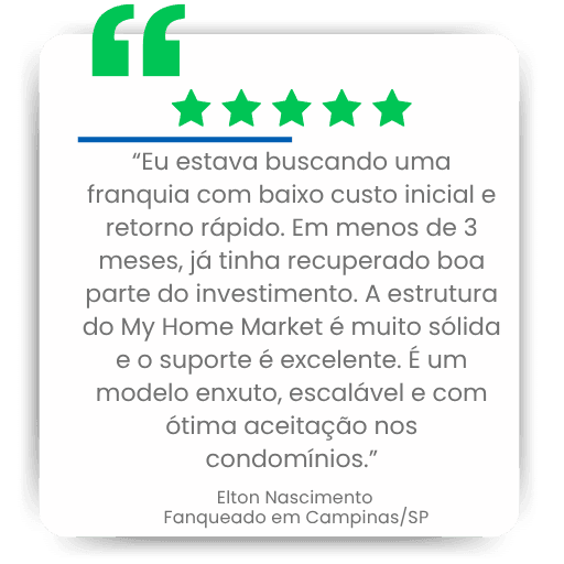 Com estrutura enxuta, instalação simples e operação descomplicada, o My Home Market é uma franquia acessível para quem quer começar a empreender com segurança. O modelo foi pensado para quem busca retorno rápido e baixo risco, com um custo-benefício muito superior ao de franquias tradicionais do varejo.